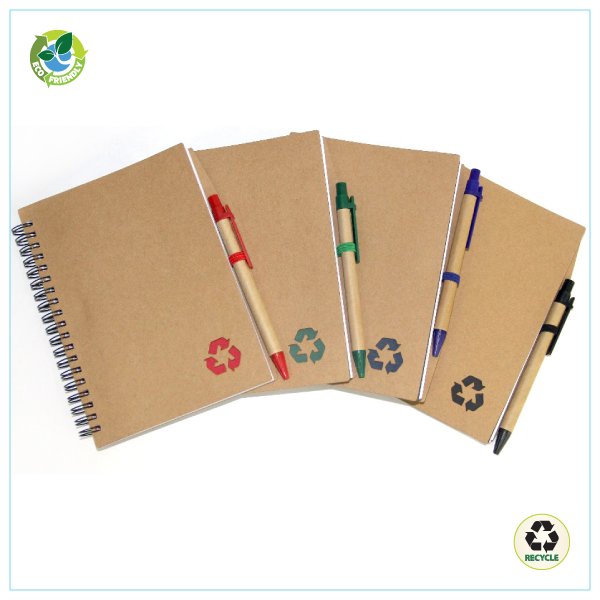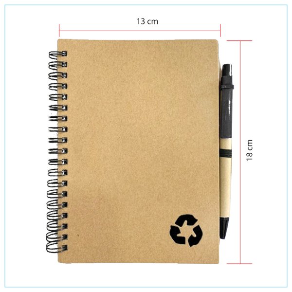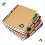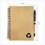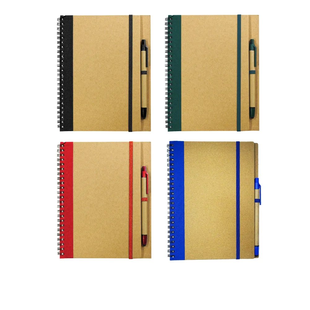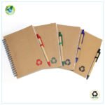 An elastic band, a pen, and a pen loop are all included in recycled promotional notebooks. As a result, these notebooks serve a variety of functions. It functions as a notepad, a pen holder, and a storage container for small items. This notebook’s cover is constructed from cardboard that has been recycled and is environmentally friendly. This makes the cover difficult. The spiral ring around this cover’s light brown exterior is black. However, it has a pen loop and a colorful elastic strap.