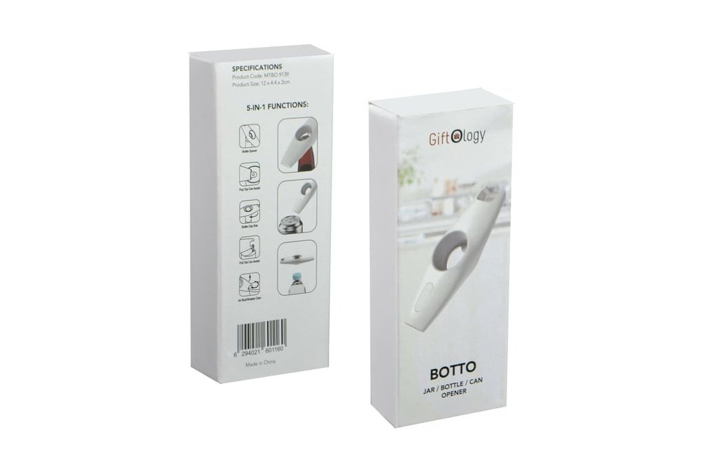 BOTTO – Giftology 5-in-1 Multi-functional Bottle Opener – White, Botto is a handy kitchen or picnic accessory with 5-in-1 multi-functions that can help open different types of seals and caps in jars, bottles, cans, etc. Great promotional product, especially for marketing your food brand or delivery service. Packed in a gift box