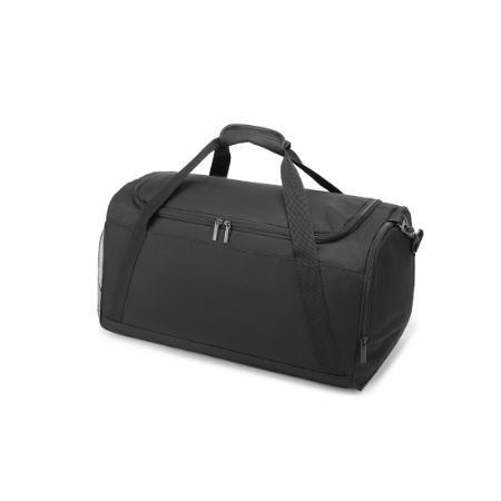 Gym bag made from polyester 600D melange with compartments: One side zippered shoe pocket ,one side open mesh pocket