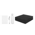 Gift set containing vacuum water bottle, pen and notebook – with matching color and premium soft touch feel.