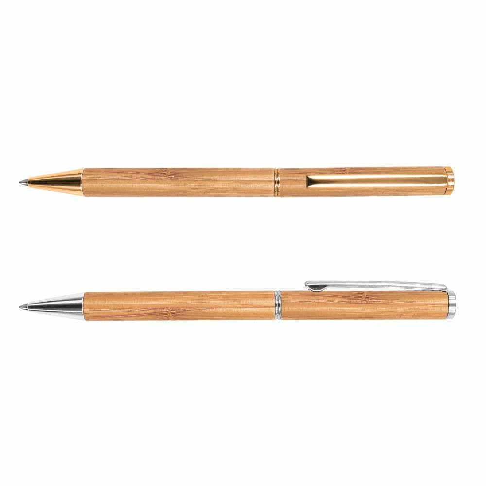 Bamboo and silver were combined in an original way to create bamboo pens with metal elements. It successfully combines nature and style. Therefore, these bamboo pens serve two purposes. The barrel of this environmentally friendly pen is constructed of authentic bamboo. Thus, these pens are kind to the environment. These bamboo pens have chrome or gold accents for a polished appearance. Options for UV printing, screen printing, and laser engraving are available on these promotional eco-friendly pens.