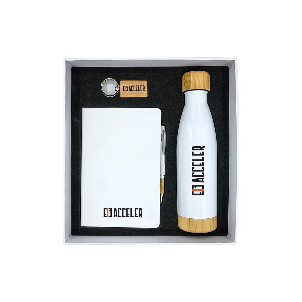 Product Includes : PU Notebook(11253), Insulated Bottle With Bamboo Lid And Base(11456) and Bamboo keychain Rectangle shape (11392), Metal Pen With Stylus and Bamboo Grip(11505),