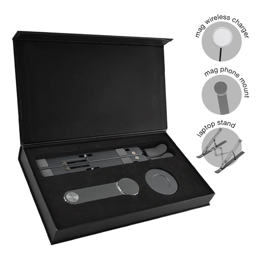This 3-in-1 kit consists of a metal phone or tablet mount for your laptop, a matching 15W universal magnetic wireless charger that can charge any wireless compatible smartphone and a laptop stand. You can now benefit by raising your laptop for better back and neck posture, while enjoying hands-free phone/tablet accessibility, convenient use of dual screens and fast universal wireless charging – all at the same time. This kit will help boost your productivity while working, studying, or on the go.